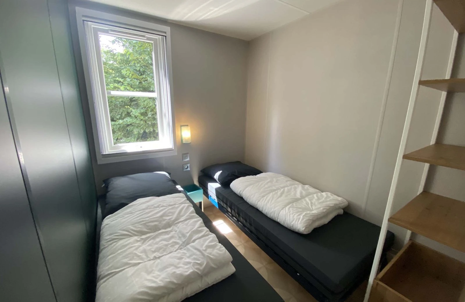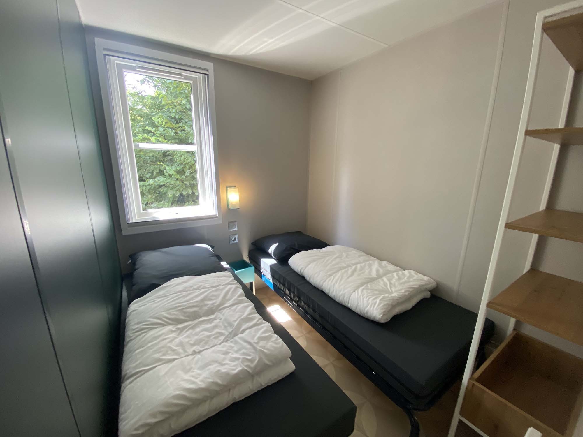 - 2 bedrooms, one bedroom with a double bed and the other with 2 single beds.